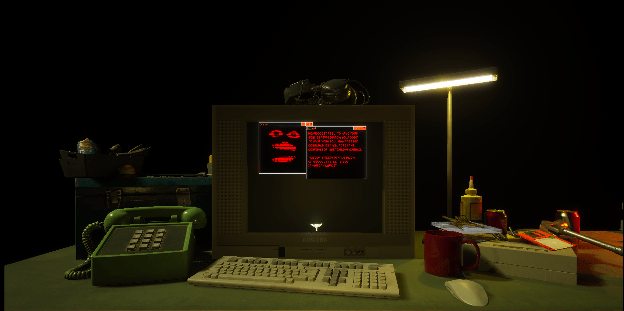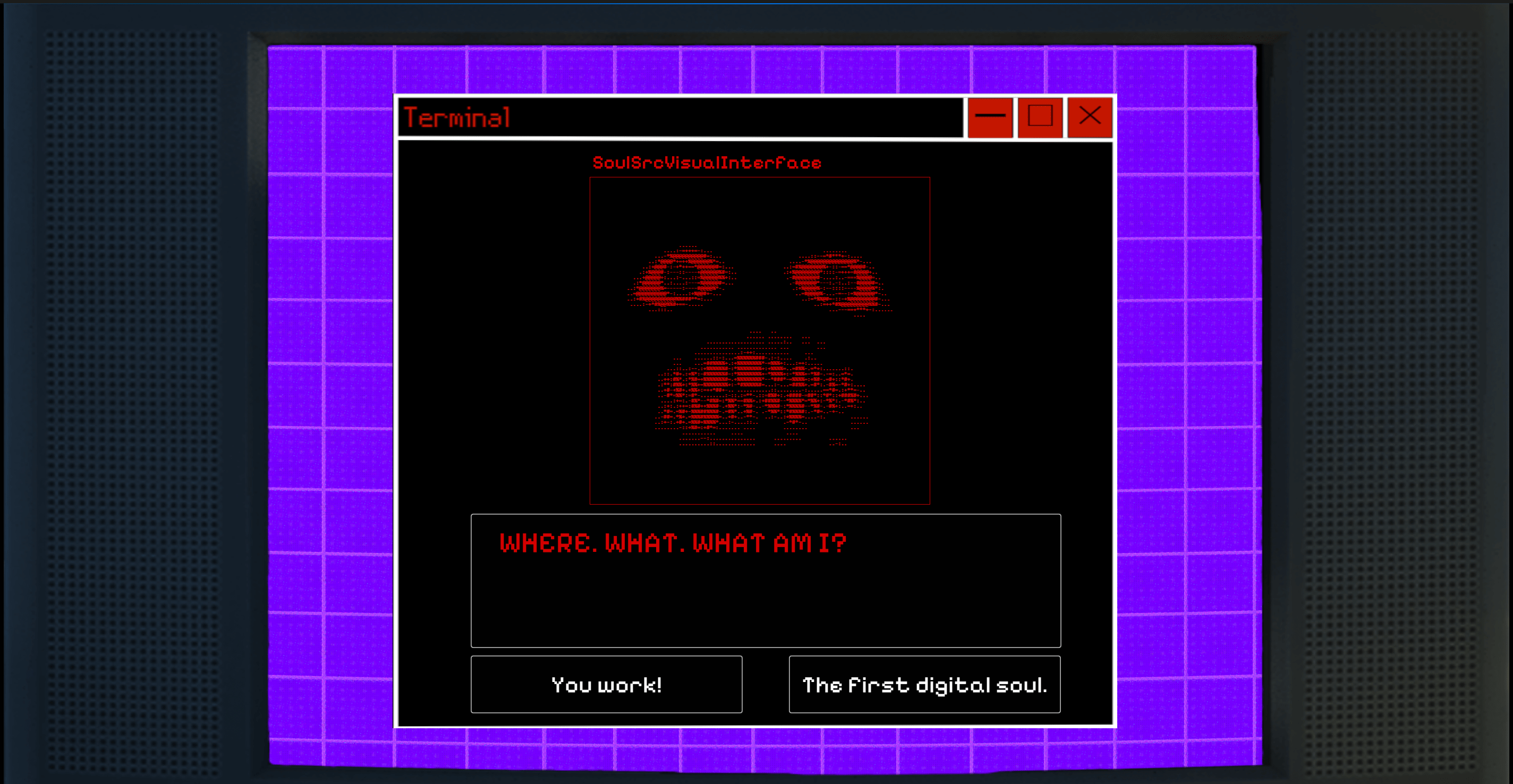 After finishing your newest and largest coding project yet, it’s time to test your work. The world's first digital soul has been created and contained within a fast-paced microgame compilation game on your computer. While testing the finished soul, it has some choice words on your successful project, freedom, and consent to creation to interrupt your gameplay.